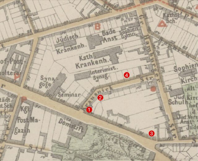 Im Jahr 1863 hatte die Familie ihre erste Wohnung in der Oranienburger Straße, am Durchbruch zur neu entstehenden Krausnickstraße mit der Hausnummer 1/2; beide Eckhäuser waren gerade erst fertiggestellt worden. Zwei Jahre später waren sie umgezogen in die Krausnickstr. 3, wo die Familie bis 1868 blieb. Im Jahr 1870 schließlich (das Jahr 1869 fehlt bei den Adressbüchern) wohnten sie wiederum in der Oranienburger Straße 12 zur Miete, und 1873 endlich bezogen sie ein Haus in der Krausnickstraße 16, das 1872 gekauft worden war; dort blieb die Familie bis 1898. Alle vier Wohnhäuser, in denen die Familie lebte, waren innerhalb eines sehr kleinen Bezirks der Stadt (Bild 2), sind heute noch erhalten und stehen unter Denkmalschutz; sie gehören zur Spandauer Vorstadt und befinden sich in unmittelbarer Nähe zur 1866 eingeweihten „neuen Synagoge“ in der Oranienburger Straße (Bild 3).