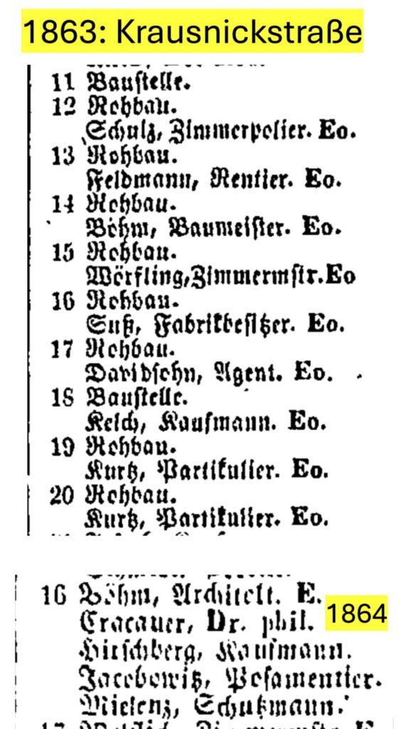 Das Haus Krausnickstraße 16 (Bild 4) war in den Jahren 1862 und 1863 gebaut worden, wie die meisten Häuser dieser Straße, die erst wenige Jahre zuvor geplant und parzelliert worden war. Namensgeber war nicht der Ort Krausnick im Dahme-Spreewald, sondern der langjährige (1834-1848, 1850-1862) Oberbürgermeister und Ehrenbürger von Berlin, Heinrich Wilhelm Krausnick (1797-1882) (4). Ihre Benennung und Nummerierung erfolgten 1861 (5). Im Adressbuch war die Straße ab 1862, im Jahr 1863 befanden sich die meisten Häuser, auch die Nr. 16, noch im Rohbau. Der Bauherr und erste Besitzer war ein Architekt, Carl Ferdinand Böhme (manchmal auch Böhm geschrieben), der das Haus vermutlich selbst geplant hatte und dort bis 1872 wohnte und als Eigentümer eingetragen war (Bild 5). In diesem Jahr verkaufte er das Haus an Julius Popper.