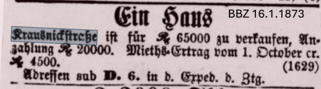 Der Kaufpreis liegt uns nicht vor – dazu müsste man das Grundbuch, das früher auch Hypothekenbuch genannt wurde, einsehen, das es auch nicht mehr gibt; wir wissen daher auch nicht, wie der Architekt Böhme und insbesondere wie Julius Popper den Kauf finanziert hatten, aber wir haben zumindest eine Idee von den Kosten: Vergleichbare Häuser in der Krausnickstraße, die um diese Zeit auf dem Immobilienmarkt angeboten wurden, sprachen von einem Kaufpreis von 65.000 Taler (Bild 6). Zieht man von diesem Preis den Versicherungswert eines Hauses ab, erhält man den ungefähren Bodenwert. Den Versicherungswert wiederum listet das Register der Feuersocietät, das auch die oben angegebenen Hausmaße dokumentierte.