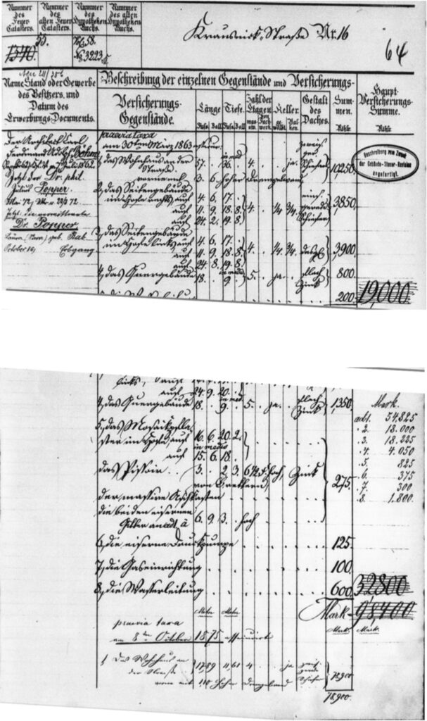 Als Architekt Böhme das Haus zum ersten Mal versicherte (30. März 1863), lag der Versicherungswert bei 19.000 Taler, was einer heutigen Kaufkraft von etwa 680.000 € entspräche (6). Zehn Jahre später, beim Kauf durch Julius Popper im Mai 1872, war der Wert auf 32.000 Taler gestiegen (Kaufkraft-bereinigt 790.400 €). Versichert waren damit das aus vier Teilen bestehende Wohngebäude (Vorderhaus, zwei Seitenflügel, Quergebäude), das Mosaikpflaster im Hof sowie einige Einrichtungen, wie z.B. ein Toilettenhaus im Hof (Kanalisation gab es erst nach 1871), ein massiver Aschkasten für die Heizungsanlage, eine eiserne Gitteranlage, vermutlich an den Vorderfront-Fenstern, eine eiserne Druckpumpe (?), die Gasleitung und die Wasserleitungen.