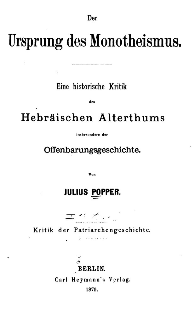 Fünfzehn Jahre nach der Schulbibel wandte sich Popper erneut seinen theologischen Forschungen zu. 1879 erschien sein umfangreichstes Werk: „Der Ursprung des Monotheismus“ (Bild 5).
