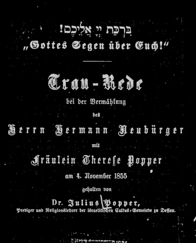 Trau-Rede bei der Vermählung des Herrn Hermann Neubürger mit Fräulein Therese Popper am 4. November 1855, gehalten von Dr. Julius Popper, Prediger und Religionslehrer der israelitischen Cultus-Gemeinde zu Dessau. Dessau, gedruckt von Hermann Neubürger 1855.