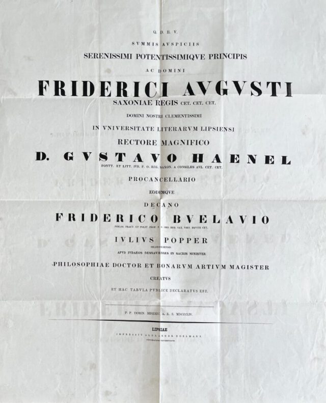 Bild 2: Ernennungsurkunde zum Doktor der Philosophie für Julius Popper von der Universität Leipzig, ausgegeben 1854 (aus dem Familiennachlass).