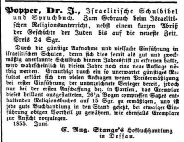 Israelitische Schulbibel und Spruchbuch zum Gebrauch beim israelitischen Religionsunterrichte nebst einem kurzen Abriß der Geschichte der Juden bis auf die heutige Zeit von Dr. Julius Popper. Dessau, Verlag der Hofbuchhandlung von C. Aug. Stange 1854 (2. Auflage 1872).