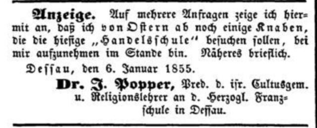 Bild 6. Anzeige der Eröffnung eines Knaben-Pensionats in Dessau durch Julius Popper 1855 (Quelle: Allgemeine Zeitung des Judenthums, 19. Jahrgang (1855) Nr. 2, Seite 25)