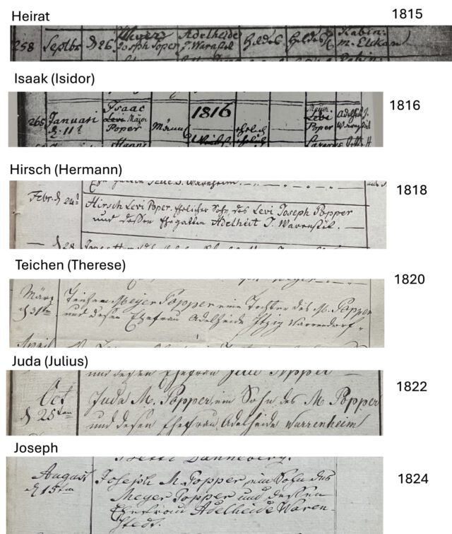Bild 5. Die Heirat von Meyer Popper mit Adelheid Warrenstedt 1815 und die fünf nachfolgenden Geburten ihrer Kinder (aus: (3)).