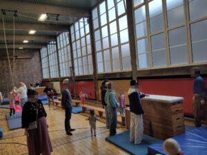 Es muss über Bänke balanciert, Kästen auf schmalen Sprungbrettern erklommen und erklettert sowie auf Matten gehüpft werden. Ringe dienen zum Baumeln und Schaukeln, Softbälle zum Schießen und Werfen, Hütchen zum Ordnen und Sortieren sowie Hula-Hoop-Reifen für Beckenbodenübungen. Die Basketballkörbe können selbstverständlich auch in Zielübungen eingebunden werden. Außerdem ist am Hallenende eine breite Kletterwand, an der die Kinder die Halle ungefähr auf halber Höhe erklimmen können.