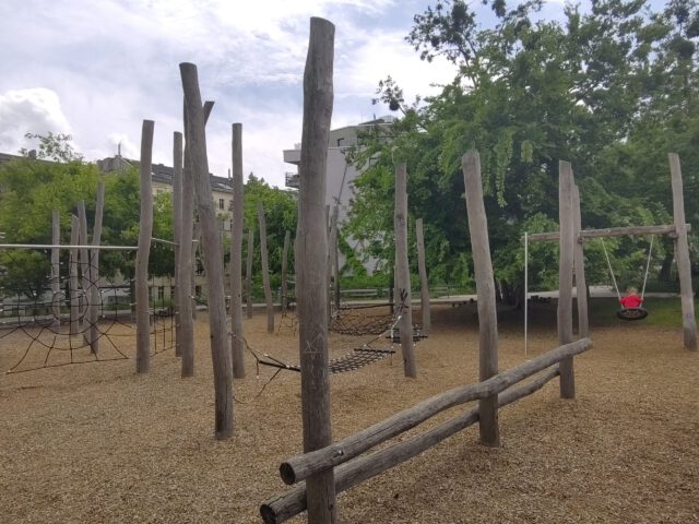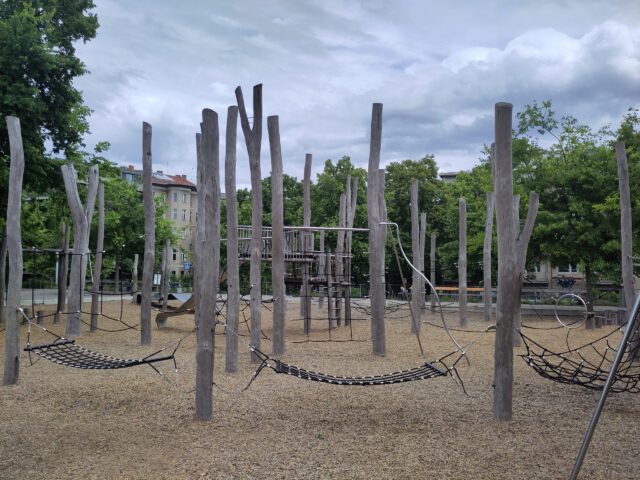 Haben Sie einen oder mehrere unermüdliche Kletteraffen zu Hause? Suchen Sie eine geschickliche Herausforderung für alle Schwierigkeitsgrade? Dann ist der Stangenwald etwas für Sie. Sollten diese Faktoren nicht zutreffen, ist von diesem Spielplatz abzuraten. Denn er ist zu einem Zweck entworfen und gebaut worden: Klettern, Klettern, Klettern. Und Hangeln. Er befindet sich an der Kreuzberger Wiese im Gleisdreieckpark, an der Treppe zur Möckernstraße und präsentiert eine Vielfalt an Möglichkeiten, sich horizontal oder vertikal kletternd fortzubewegen: Sei es das klassische quadratische Netz, ein Spinnennetz, Netze im Stil einer Leiter oder Matten-Netze, hier finden alle ihr Lieblings-Element.
