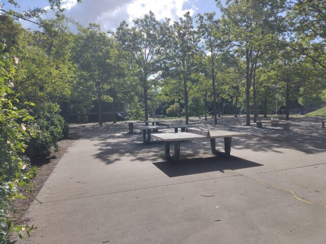 Außerdem gibt es ein wenig abgelegen und streng genommen nicht mehr zum Spielplatz gehörend drei Tischtennisplatten, die unter Bäumen gut positioniert im Schatten liegen.