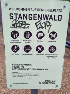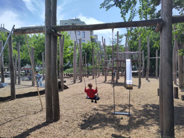 Wichtig zu wissen ist, dass kein Material zum Sandeln mitgenommen werden muss, da es auf diesem Spielplatz keinen Sand gibt. Man könnte also mit den Schäufelchen und Eimern höchstens mulchen, wobei der Burgbau aber schwierig ausfällt.