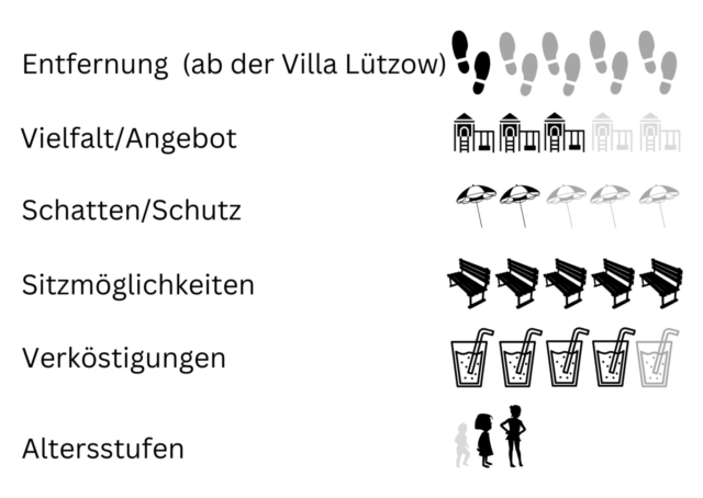 Auf dem ganzen Spielplatz sind reichlich Bänke und Sitzmöglichkeiten verteilt. Die große Wiese nebenan lädt zusätzlich zum Ausruhen und Picknicken ein. Wer das Lunchpaket oder Getränke vergessen haben sollte, kann sich am Kiosk direkt neben dem Spielplatz mit (Kalt-)Getränken, kleineren Backwaren oder Eis eindecken. Dort ist praktischerweise auch gleich eine Toilette zu finden.