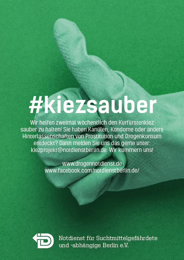 Am 1. April 2019 startete der Notdienst für Suchtmittelgefährdete und –abhängige Berlin e.V. mit einem neuen Nachbarschaftsprojekt: Zweimal wöchentlich werden öffentliche Plätze rund um den Kurfürstenkiez von Hinterlassenschaften der Prostitution und Konsumutensilien befreit, um ein saubereres, verbessertes Umfeld zu schaffen. Das Projekt wird durch das Bezirksamt Mitte bis zum 31.Dezember 2019 gefördert.