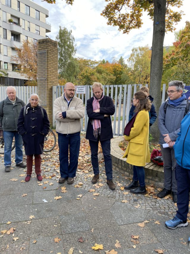 Auf dem Weg von der Lützow- zur Kurfürstenstraße an der Kita „Hahn“ gab es spontan einen Stopp hinter dem ‚Haus am Lützowplatz‘, auf dem Stadtrat Ephraim Gothe auf eine Baulücke zwischen den dortigen Stadtvillen hinwies. Hier wird das Haus am Lützowplatz bald ein Punkthaus mit Wohnungen und Ateliers für Künstler bauen, die in Berlin zu Gast sind.