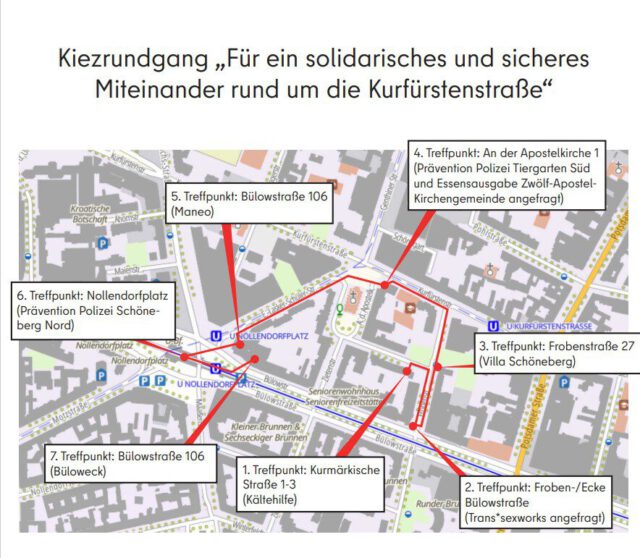 am Donnerstag, 4. Dezember 2025 laufen wir unter dem Motto: „Gemeinsam für ein sicheres und solidarisches Miteinander“ entlang verschiedener Stationen durch den Kiez und lernen Akteur*innen kennen, die zu den Themen Drogenkonsum, Obdachlosigkeit und Sexarbeit in unserem Kiez arbeiten. Wir erhalten Einblicke in ihre Arbeit und tauschen Herausforderungen und Perspektiven aus.