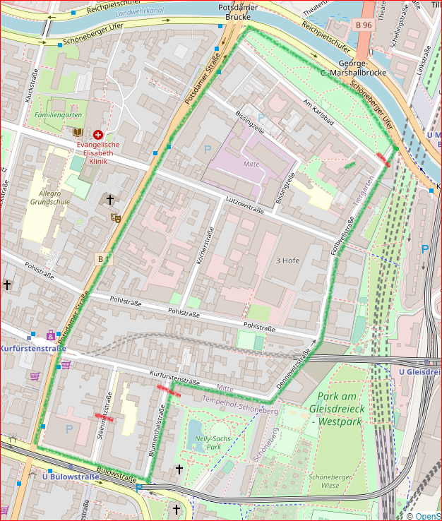 Dann werden wir aufbrechen und uns auf einem ca. 1 ½ km langen Gang durch den Kiez das alles ansehen und für Fragen, Hinweise zur Verfügung stehen. Wir werden den Spaziergang in der Flottwellstraße/Ecke Schöneberger Ufer beenden.