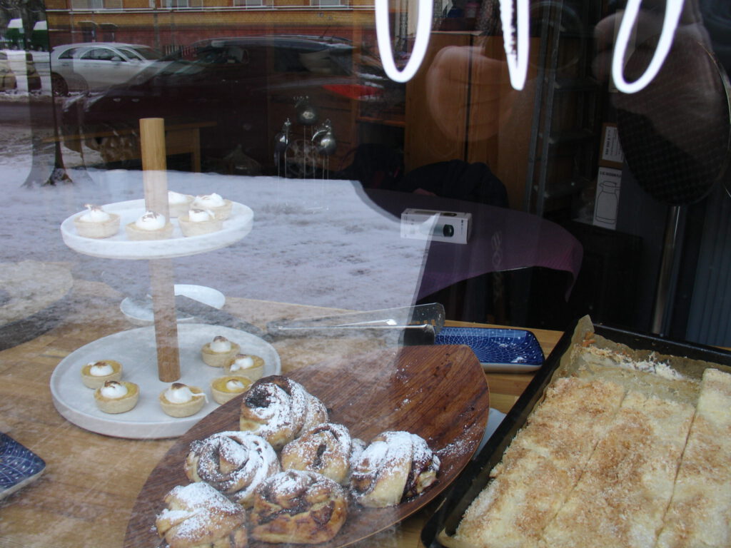 Die Entscheidung für eines der Desserts fällt schwer: Hefegebäck mit Zimt-Pflaume, Mohn-Pistazien-Kuchen oder kleine Obst-Tartes gehören zum täglich wechselnden Angebot. Alles ist gut sichtbar hinter den großen Fenstern platziert.