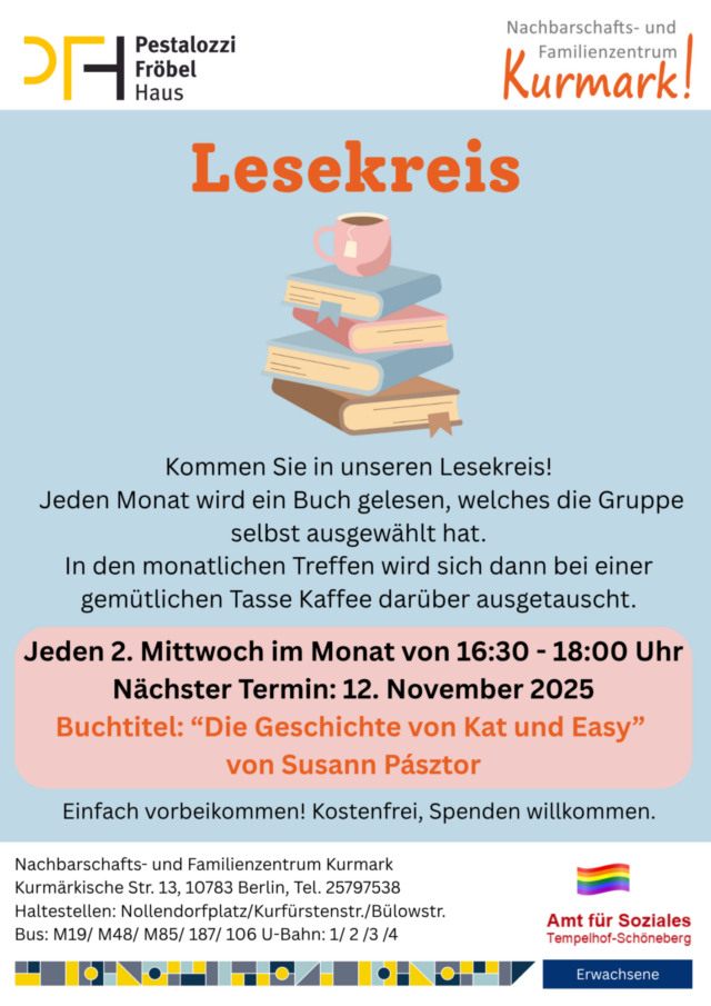 Lesekreis: Der aktuelle Buchtitel, welcher bis zum 12. November gelesen und dann besprochen wird, ist: „Die Geschichte von Kat und Easy“ von der Autorin Susann Pasztor.