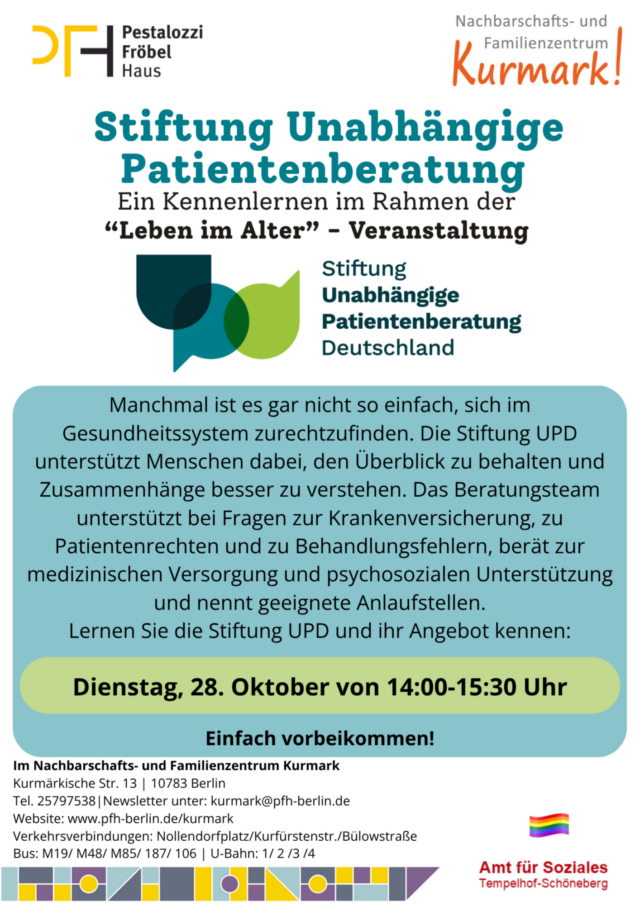 Am Dienstag, 28. Oktober von 14:00 – 15:30 Uhr wird sich die Stiftung Unabhängige Patientenberatung Deutschland Ihnen vorstellen. „Die Stiftung UPD unterstützt Menschen dabei, den Überblick zu behalten und Zusammenhänge besser zu verstehen. Das Beratungsteam unterstützt bei Fragen zur Krankenversicherung, zu Patientenrechten und zu Behandlungsfehlern, berät zur medizinischen Versorgung und psychosozialen Unterstützung und nennt geeignete Anlaufstellen.“ Lernen Sie die Stiftung, ihr Angebot und zwei Berater*innen kennen. Einfach vorbeikommen!