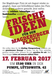 Da das Bezirksamt bislang keine Maßnahme zur Umgestaltung des Platzes geplant hatte, sollte mit dem Beteiligungsverfahren herausgearbeitet werden, wie es um die Aufenthaltsqualität des Magdeburger Platzes beschaffen ist und welche Aufwertungsmaßnahmen vorgeschlagen werden.