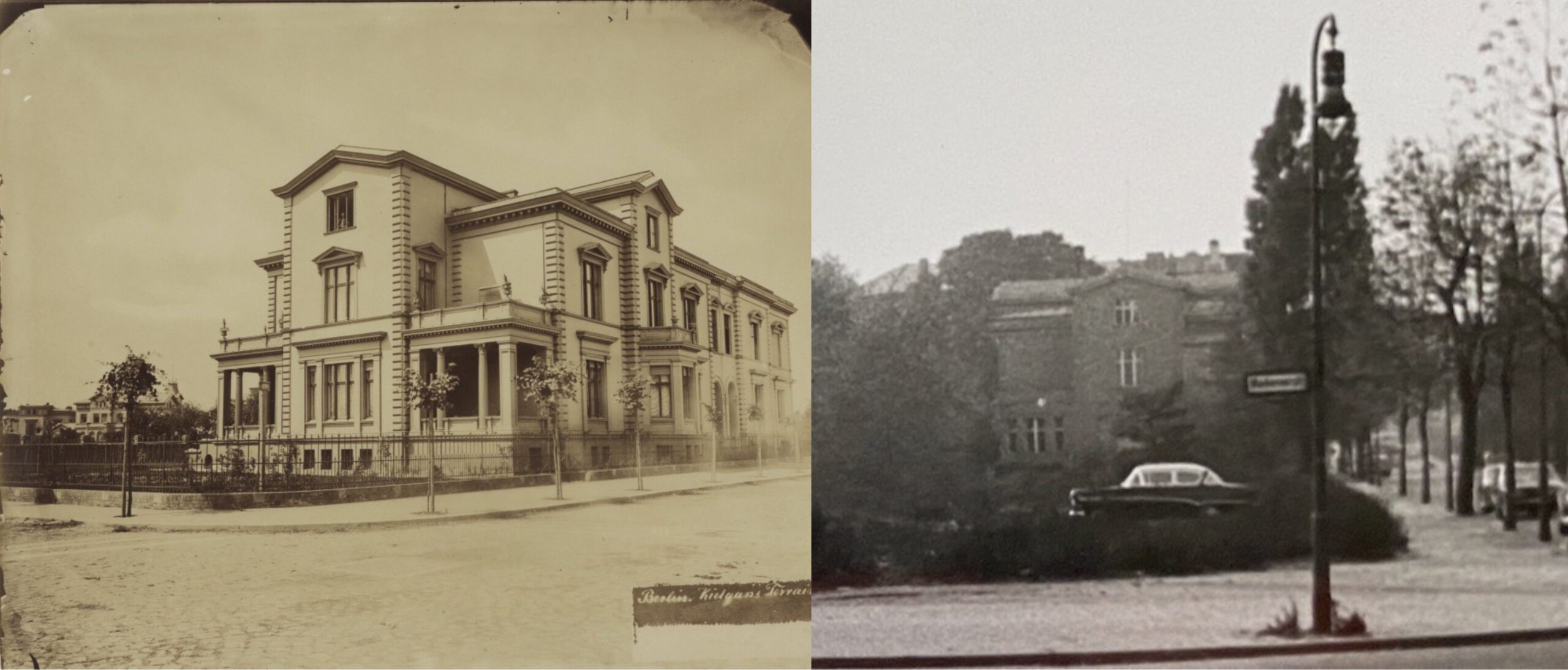 Villa Luedersdorff, Kurfürstenstraße 133 Ecke Kielganstraße, gebaut 1873. Links eine frühe Aufnahme um 1875, rechts eine Aufnahme an der Ecke Kurfürstenstraße/Motzstraße von 1958 über die inzwischen von Trümmern geräumten Grundstücke Kurfürstenstraße 137 bis 134 auf die noch vorhandene Villa (Quellen: Berlinische Galerie, aus dem Nachlass von M.Panckow, Reproduktionen von M.Hawlik für die Berlinische Galerie, gemeinfrei; rechts: Foto von 1958, Fotograf unbekannt, aus der Bauakte (Nebenakte) des Gebäudes Kurfürstenstraße 136/137, Bezirksamt Schöneberg, gemeinfrei)