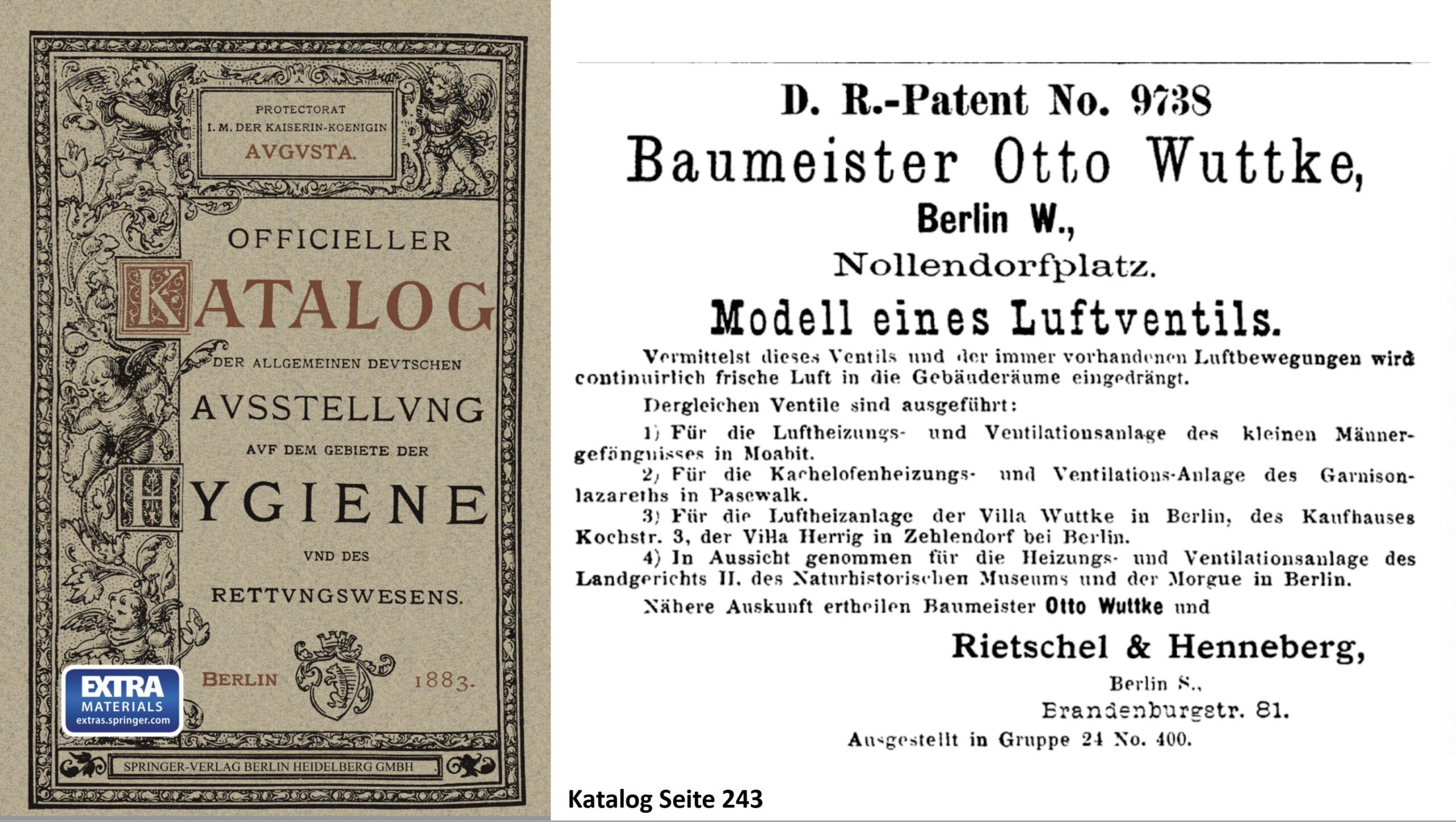 Weit mehr als in seinen Gebäuden wird dieses Patent in den folgenden 30 Jahren vor allem in öffentlichen Gebäuden technisch um- und eingesetzt, in Schulen, Lazaretten, Gefängnissen etc.; es wird auch auf Hygiene-Ausstellungen (1883) (Bild 5), in ingenieur-wissenschaftlichen Gesundheitsjournalen (1880, 1881, 1906) und sogar im Brockhaus (1886) gezeigt und diskutiert. Anders als die Architekten hatten die Ingenieure offenbar wenig Berührungsängste mit dem Baumeister, der hier technische Kompetenz demonstriert. Das belegt auch indirekt die Anzeige im Katalog der Hygiene-Ausstellung Berlin 1883 (Bild 5): Wuttke verweist als Referenz für sein Ventil auf die Firma Rietschel & Henneberg, Berlin. Hermann Rietschel (1847-1914) war Professor für Ventilation und Heizung an der Königlichen Technischen Hochschule Berlin, das Rietschel-Institut für Lüftungstechnik existiert noch heute und unter diesem Namen – möglicherweise lassen sich in den Archiven dieses Instituts noch Spuren von Otto Wuttkes Ventilationstechnik entdecken.