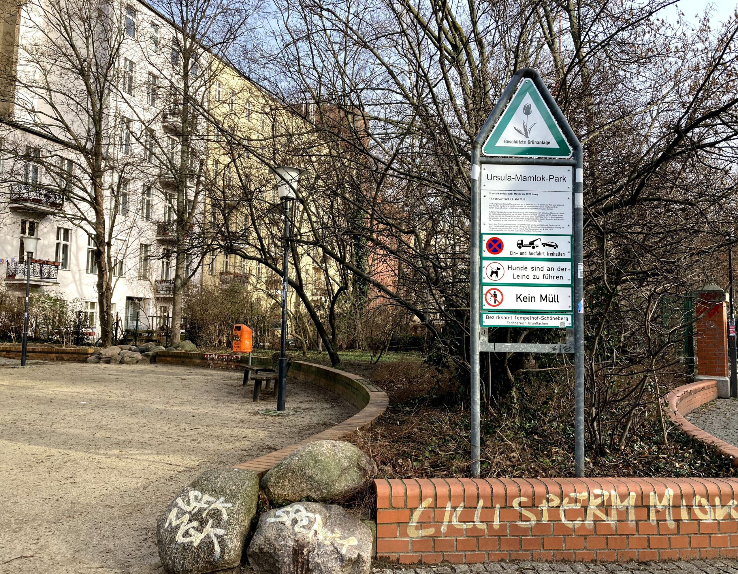 Anlässlich ihres 100sten Geburtstages wurde am 1. Februar die kleine Rasenfläche östlich vom Winterfeldplatz, in der Gleditschstraße 3-23, in „Ursula-Mamlok-Park“ benannt.