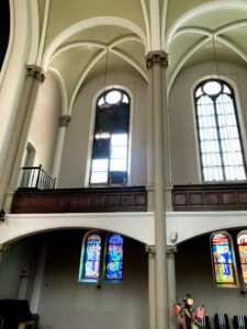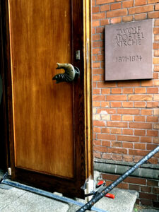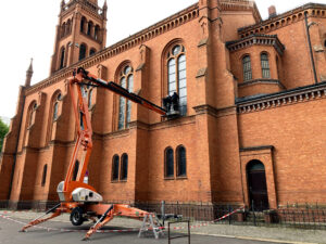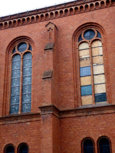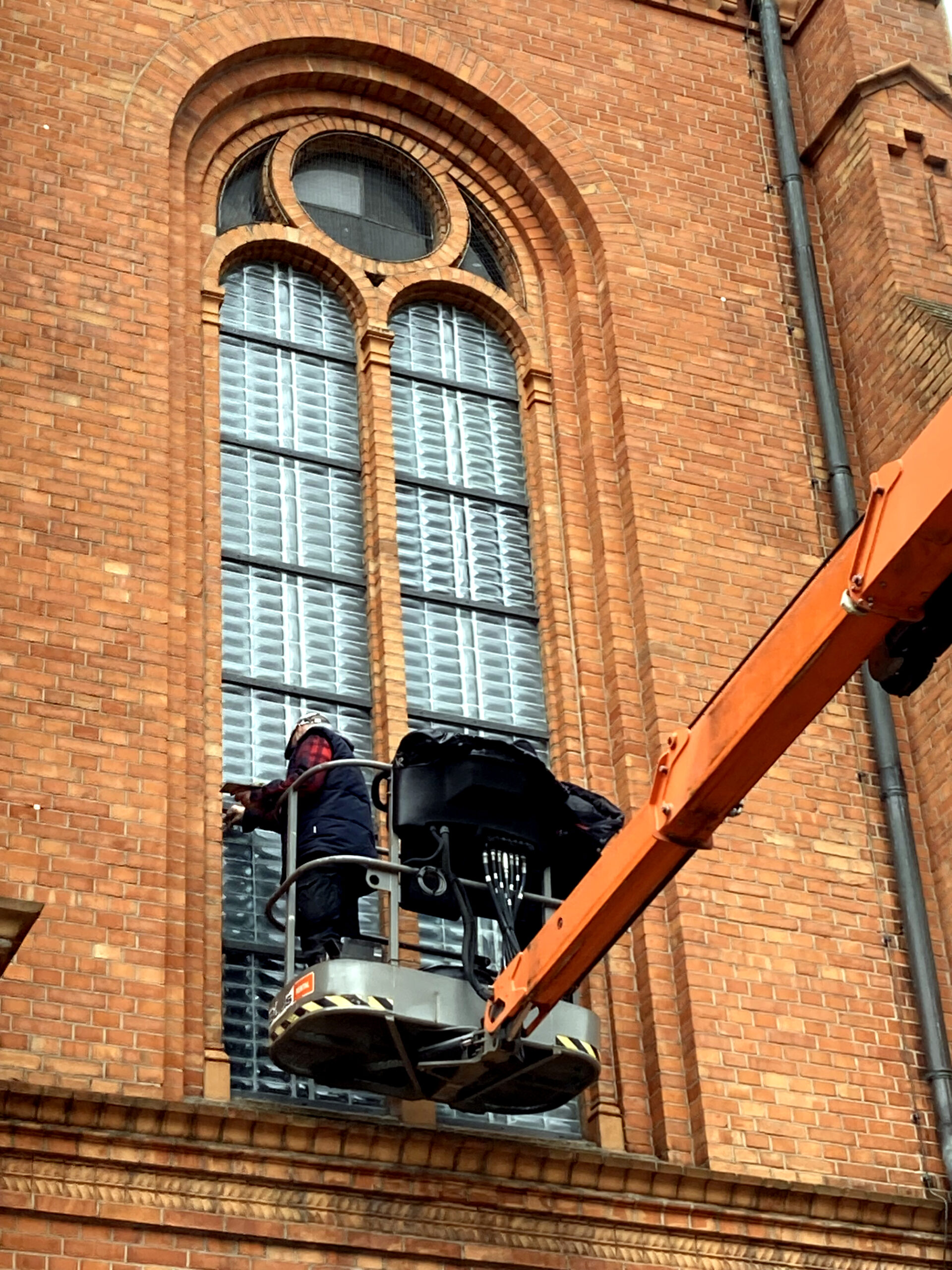 Endlich ist es nun so weit. Die Arbeiten an den denkmalgeschützten Fenstern der westlichen Empore der Zwölf-Apostel-Kirche haben begonnen. Die Spanplatten wurden entfernt und neue Glasbausteine eingemauert.
