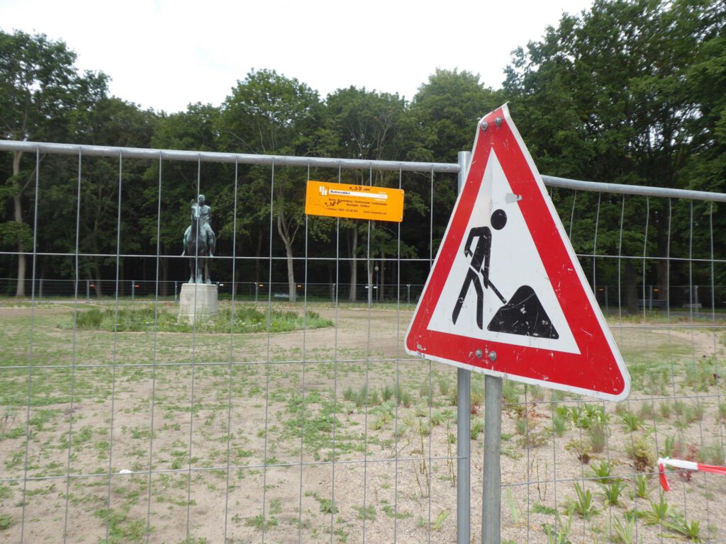 Rund um die Statue „Amazone zu Pferde“ von Louis Tuaillon in der Mitte des Platzes sind die ersten zarten Blumen zurzeit durch den Bauzaun zu betrachten. Demnächst sollen Besucher*innen hier picknicken oder in der Sonne liegen können.