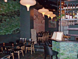 Unter einem eleganten Dach im Stil des Art Déco gelangt man von außen in das Restaurant. Auffällig das Schwarz der Wände und Decken, unterbrochen von dunkelgrünen Fliesen im vorderen Bereich in Kombination mit einem Eichenholzfußboden. Die Leuchten geben ein dezentes Licht und erinnern an japanische Lampions. Es gibt eine zweite Ebene, die sich mit einer Ziegelwand mit Damwildgeweihen etwas rustikaler präsentiert.