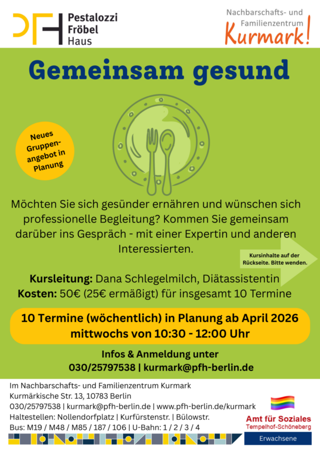 „Gemeinsam Gesund“ – neues Gruppenangebot in Planung!Möchten Sie sich gesünder ernähren und wünschen sich professionelle Begleitung? Kommen Sie gemeinsam darüber ins Gespräch – mit einer Expertin und anderen Interessierten.10 Termine (wöchentlich) ab April 2026, mittwochs von 10:30 – 12:00 UhrKursleitung: Dana Schlegelmilch, DiätassistentinKosten: 50€ (25€ ermäßigt) für insgesamt 10 Termine (gepplante Inhalte siehe Anhang)