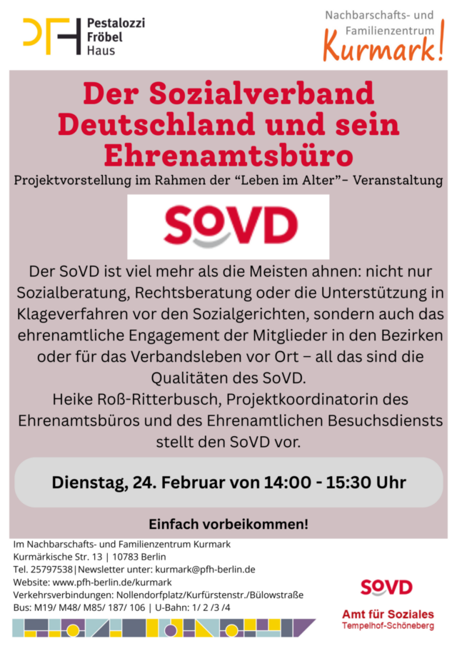 in der nächsten „Leben im Alter“-Veranstaltung bei uns im NFZ Kurmark wird sich der Sozialverband Deutschland vorstellen. Der SoVD ist viel mehr als die Meisten ahnen: nicht nur Sozialberatung, Rechtsberatung oder die Unterstützung in Klageverfahren vor den Sozialgerichten, sondern auch das ehrenamtliche Engagement der Mitglieder in den Bezirken oder für das Verbandsleben vor Ort – all das sind die Qualitäten des SoVD. Heike Roß-Ritterbusch, Projektkoordinatorin des Ehrenamtsbüros und des Ehrenamtlichen Besuchsdiensts stellt den SoVD vor – am Dienstag, den 24. Februar von 14:00 – 15:30 Uhr. Seien Sie herzlich eingeladen und kommen Sie einfach vorbei!