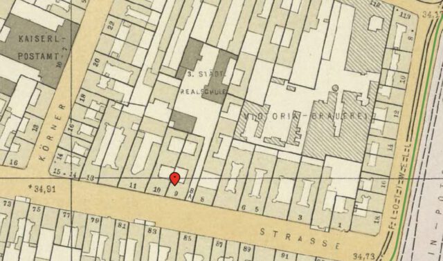 Bild 1: Die Steglitzer Straße mit dem Weg zur Körner-Realschule zwischen den Hausnummern 8 und 9 (Quelle: Histomap mit dem Straube-Plan von Berlin von 1910, gemeinfrei).