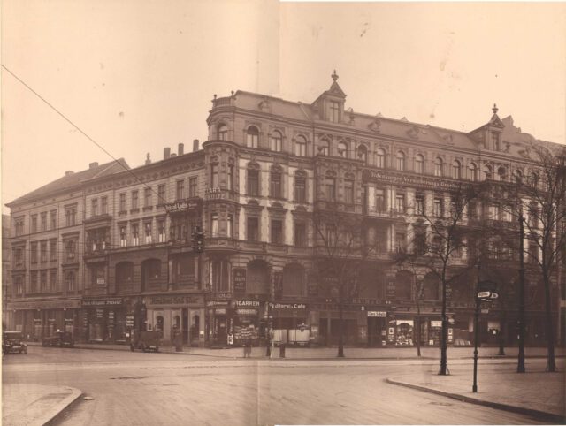 Von alldem war mir als Kind nichts bekannt, der Aufzug nach dem Krieg nicht mehr in Betrieb und ich ahnte nicht, dass ich täglich am Schacht des Aufzugs vorbeiging, der sich unsichtbar hinter einer Wand verbarg. Aber weiter mit der Geschichte. Im Laufe der Jahrzehnte wechselten die Mieter, es gab hier im Obergeschoß das Photoatelier Th. Diepenbach, im ersten Stock war der Teppichhändler D.L. Haim. Ein Herr Schmeisser hatte im Eckladen zur Eichhornstraße einen Tabakwarenladen. In der oberen Etage hatte das Schneideratelier Clara Schultz seinen Betrieb, der sich bis in das Dachgeschoss ausdehnte. Zu den Kundinnen gehörte unter anderen die Schauspielerin Fritzi Massary.