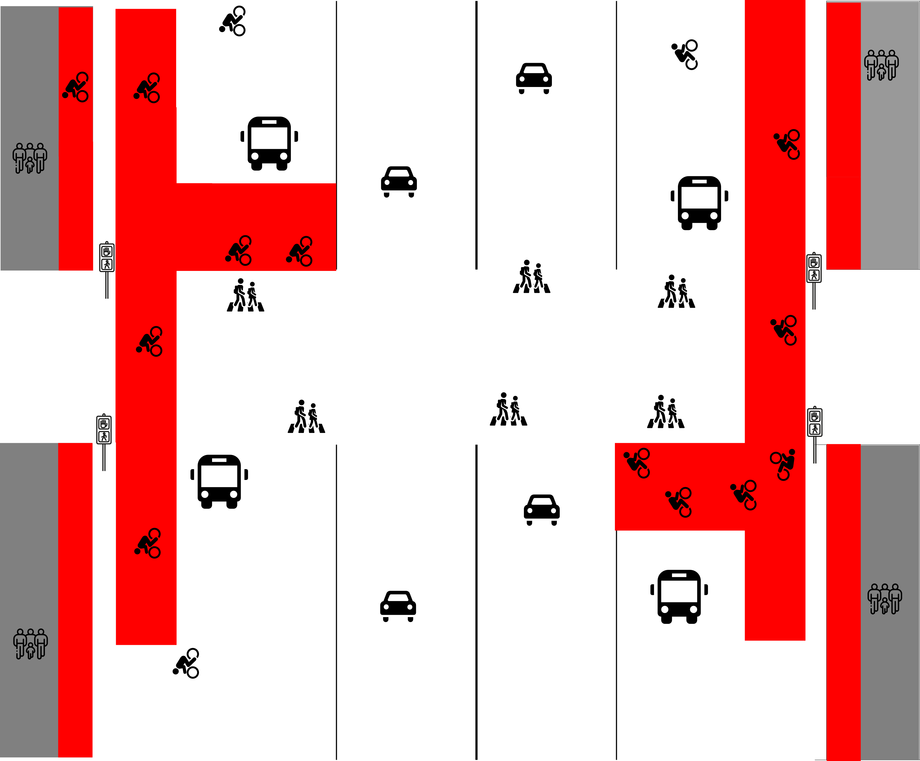 - An den Kreuzungen sollten Aufstellflächen auf der rechten Seite von mindestens zwei Fahrradlängen und vor der Busspur markiert sein, so dass Radfahrende bei Rot vor den Bussen stehen und bei Grünschaltung gut sichtbar losfahren können. Diese Aufstellflächen sollten rot markiert sein.