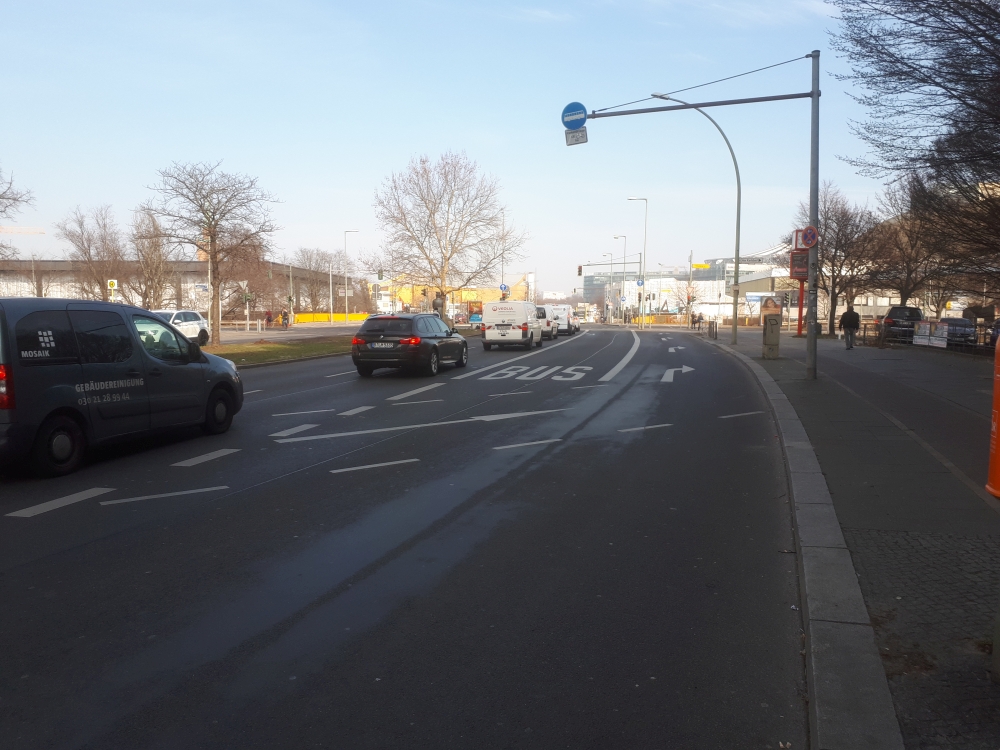 Die Potsdamer Straße ist eine nachweislich hoch frequentierte Nord-Süd-Tangente. Die Busspur ist bislang jedoch nur von 7-9 und 14-18 Uhr als solche ausgewiesen, so dass sich Radfahrende in den überwiegenden Zeiten ohne Schutz in den Autoverkehr eingliedern müssen.