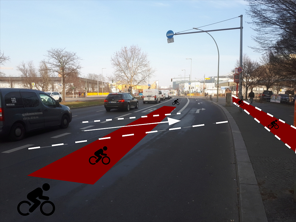 Da in den zusätzlichen Zeiten der Kfz-Verkehr auf der Potsdamer Straße weniger dicht ist, würde eine solche Regelung die Kraftfahrzeuge nicht wesentlich benachteiligen. Sollte es trotzdem zu Staus kommen, wären es ohnehin wünschenswert, dass Busse und Taxis schneller vorankommen. - Die Benutzungsmöglichkeit der Busspur für Radfahrende sollte besser sichtbar gemacht werden. Dies kann dadurch erfolgen, dass auf der Busspur zusätzliche Fahrradpiktogramme aufgebracht werden. An den Einfahrten sollten diese um 90 Grad gedreht sein.