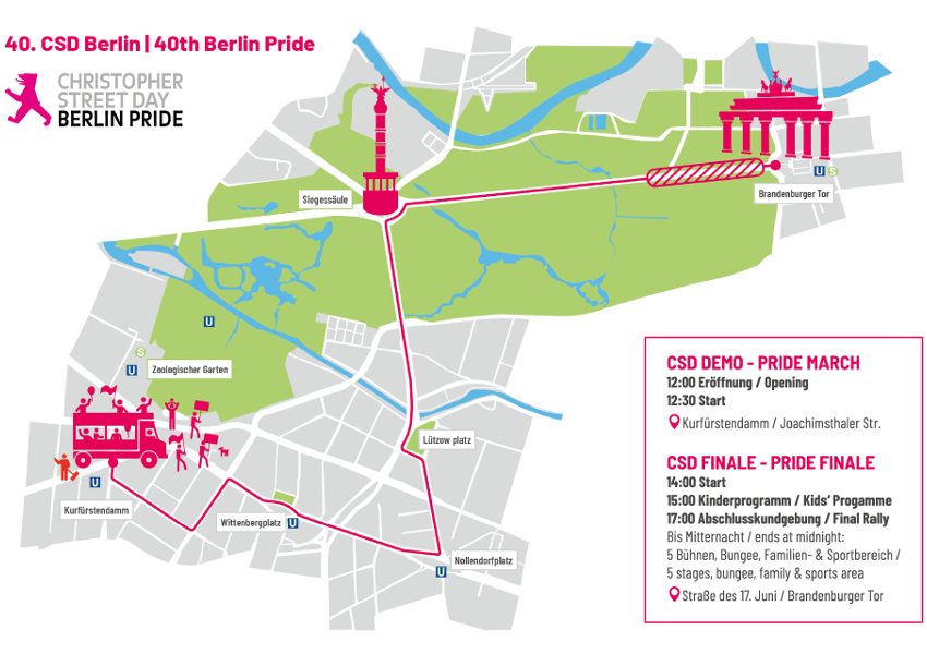 Auch dieses Jahr findet unter dem Motto „Mein Körper, meine Identität, mein Leben!“ der Christopher Street Day statt. Zum 40. Mal! Nach Eröffnung durch Kultursenator Klaus Lederer um 12h00 startet der Umzug um 12h30 Uhr am Kurfürstendamm/ Ecke Joachimsthaler Straße. Von dort geht es über die Augsburger Str. -> Nürnberger Str. -> Tauentzienstr. -> Wittenbergplatz -> – auch durch unseren Kiez: Nollendorfplatz -> Lützowplatz -> Siegessäule – zur Straße des 17. Juni