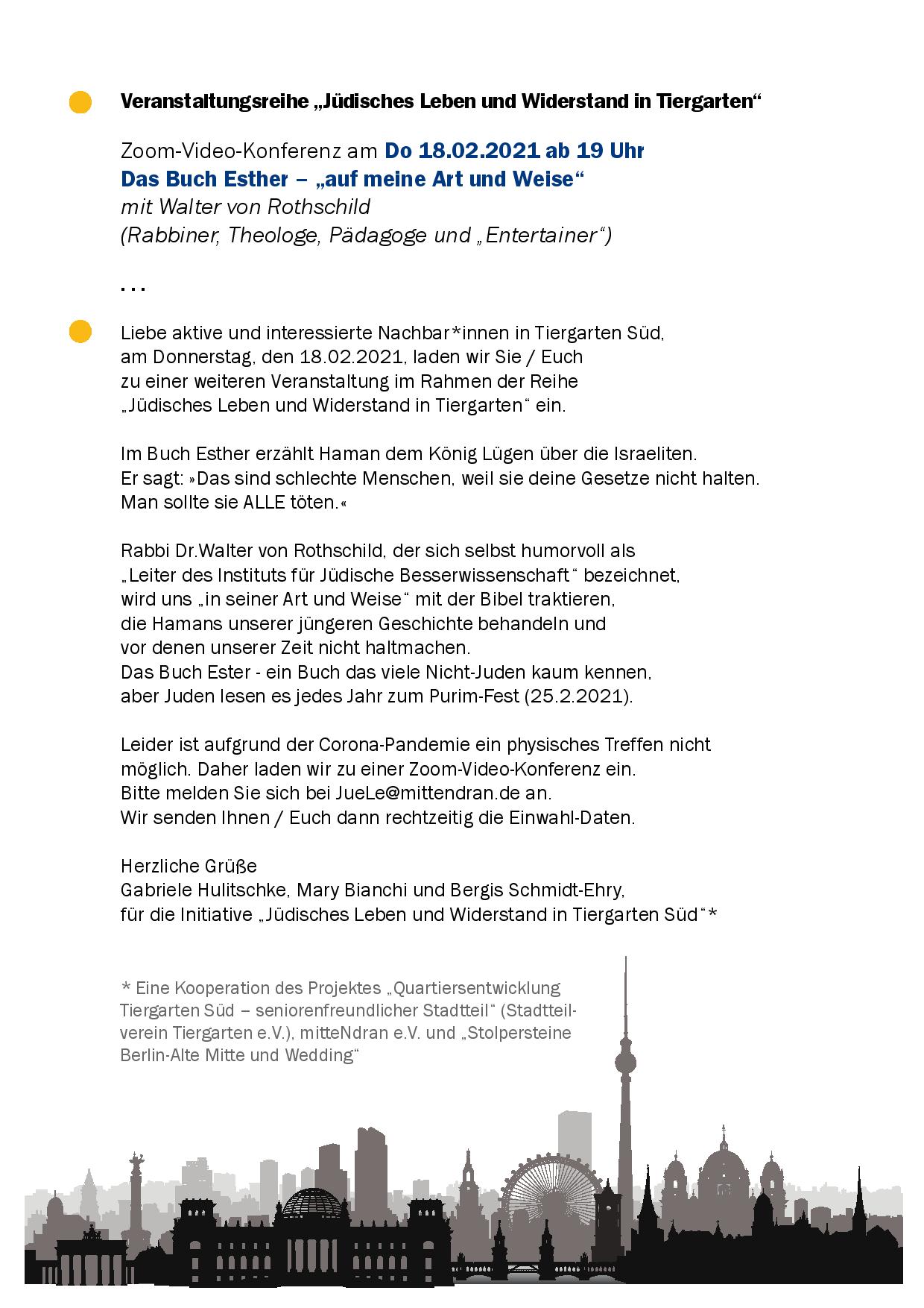 Hiermit kündigen wir die nächste Veranstaltung in der Reihe „Jüdisches Leben und Widerstand in Tiergarten“ an (siehe weiter unten) :