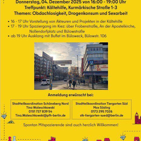Am Donnerstag, 4. Dezember 2025 laufen wir unter dem Motto: „Gemeinsam für ein sicheres und solidarisches Miteinander“ entlang verschiedener Stationen durch den Kiez und lernen Akteur*innen kennen, die zu den Themen Drogenkonsum, Obdachlosigkeit und Sexarbeit in unserem Kiez arbeiten. Weiterlesen