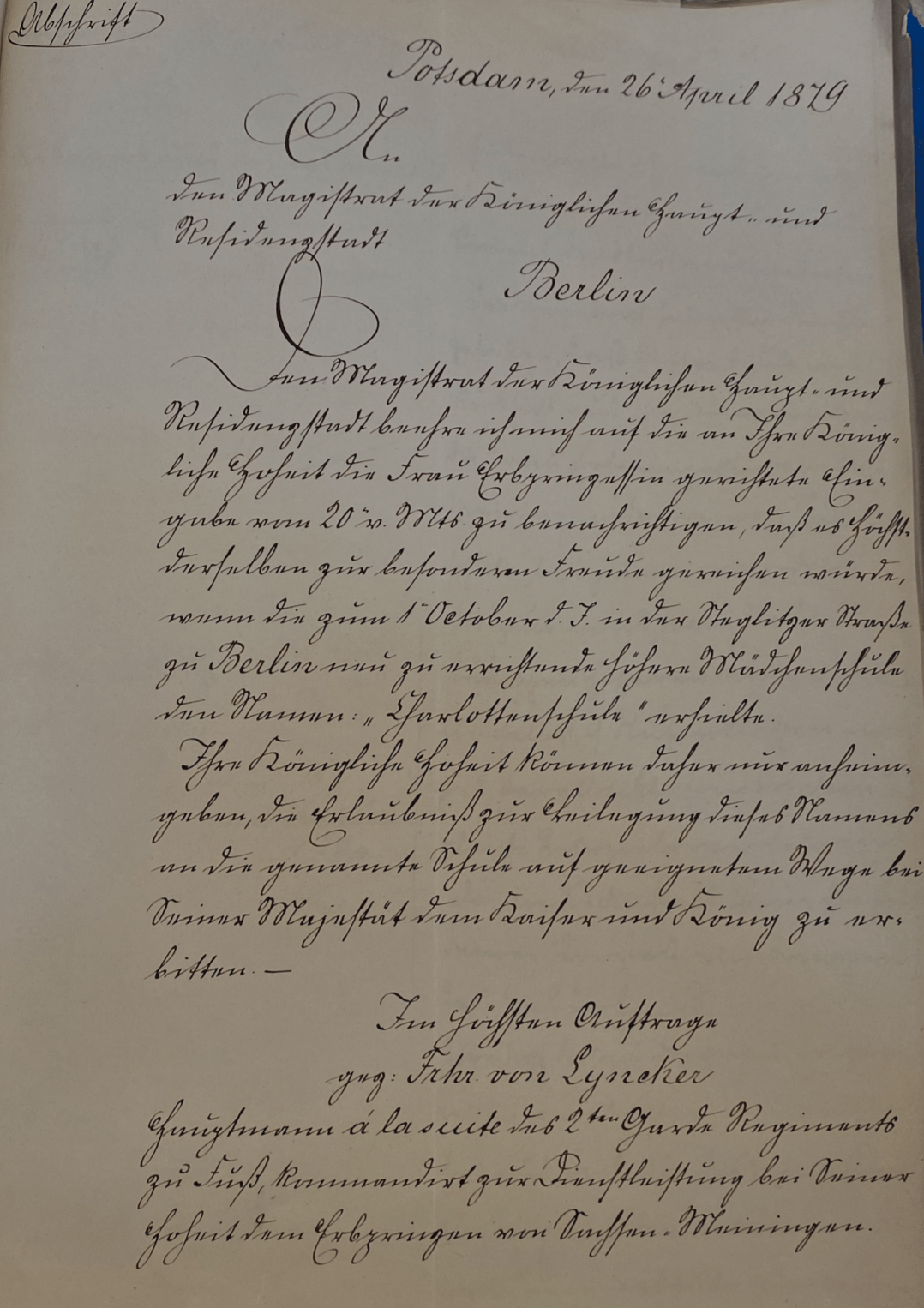 Die Namensgebung – nach der preußischen Prinzessin und Erbprinzessin von Sachsen-Meiningen, Charlotte, Tochter des Prinzen Albrecht von Preußen, Bruder Kaiser Wilhelm I. – erfolgte in einem komplexen Kommunikationsreigen diverser Institutionen (4). Dazu wandte sich zunächst der Magistrat der Stadt am 20. März 1879 an die Prinzessin und erfragte ihre Zustimmung. Ihr Ehemann – und nicht die Prinzessin selbst – ließ am 20. April 1879 durch seinen Adjutanten, Maximilian Freiherr von Lyncker (1845-1923), „Hauptmann á la suit des 2. Garde-Regiments zu Fuß, kommandiert zur Dienstleistung bei Seiner Hoheit dem Erbprinzen von Sachsen-Meiningen“ mitteilen, dass dies der Prinzessin „zur besonderer Freude gereichen würde„, und er deswegen empfehle, den Wunsch „auf geeignetem Wege bei seiner Majestät dem Kaiser und König zu erbitten“ (Bild 4). Daraufhin schrieb das Königliche Provinzial-Schulkollegium am 15. Mai 1879 an den zuständigen „Minister des geistlichen, Unterrichts- und Medicinal Angelegenheiten“ Dr. Falk (nach dem das Falk-Realgymnasium benannt ist) und machte einen entsprechenden Vorschlag. Dieser reichte den Vorschlag in einer Immediatsvorlage bei Kaiser Wilhelm I. ein, der dann in einem „allerhöchsten Erlaß“ vom 25. Juni 1879 seine Zustimmung gab, die als Telegramm aus Bad Ems kam, wo der Kaiser offenbar kurte.