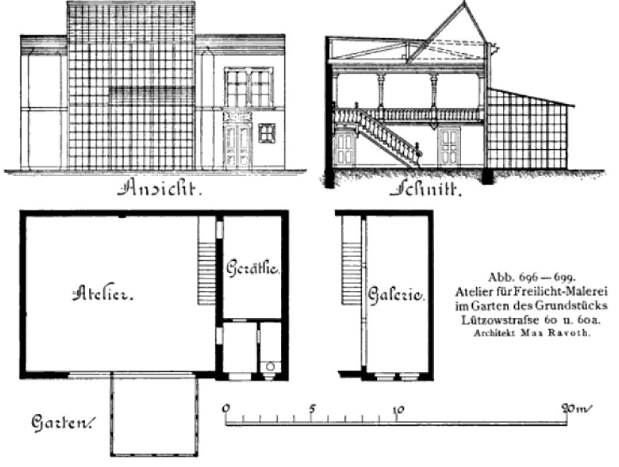 Seine Besonderheit: Es hatte „vor dem eigentlichen Arbeitsraum einen Glaskasten von 4,75 m Tiefe und 5 m Breite, der sich in ganzer Breite nach dem ersten hin öffnet. Die in denselben gestellten Modelle zeigen die gleiche Beleuchtung wie auf der Straße. Der Maler selbst steht bei seiner Arbeit im Atelier oder im Glaskasten …“ (1). Das von Max Ravoth (1850-1923) geplante Atelierhaus wurde 1887 errichtet (Bild 2), zusammen mit dem Wohnhaus an der Lützowstraße 60, das ihm gehörte. Er hatte es ein Jahr zuvor von den Kilianschen Erben gekauft. Bereits im Jahr 1887, als das neue Wohnhaus noch im Bau begriffen war, hatte Prof. Werner Schuch (1843-1918) dort sein Atelier, ein Historien- und Landschaftsmaler und Architekt. Ravoth selbst wohnte und arbeitete im Vorderhaus nach dessen Fertigstellung. Ab 1888 ist das mit zwei Seitenflügeln und einem Querflügel gebaute Haus aufgeteilt in die Nummern 60 (Eigentümer: Ravoth) und 60a (Eigentümer: Seimert) (Bild 3).