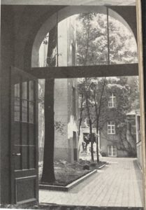 In unserem Artikel über die Klinik des jüdischen Arztes und Wissenschaftlers Prof. Ernst Unger (mittendran vom 20. März 2023) hatten wir, sehr zu unserem Bedauern, keine historischen Bilder des Gebäudes zeigen können, weil die einzigen uns bekannten Fotos Copyright-geschützt im Archiv der Bayerischen Staatsbibliothek lagen und nur gegen eine hohe Gebühr erhältlich waren. Jetzt tauchte ein Satz Bilder der Fotografin Liselotte Purper (1918-2002) auf, die diese 1937 in einer Zeitschrift (1) zur Eröffnung des „Hauses der Deutschen Frau“ veröffentlicht hatte, nachdem die NSDAP 1936 die Klinik des Prof. Unger „übernommen“ und der NS-Frauenschaft als Tagungs- und Bürogebäude überlassen hatte. Die Klinik war zu diesem Zeitpunkt im Inneren umgestaltet worden, aus Patientenzimmern waren Büros geworden, aber der idyllische Charakter des Innenhofes war erhalten geblieben (Bild 1 und 2).
