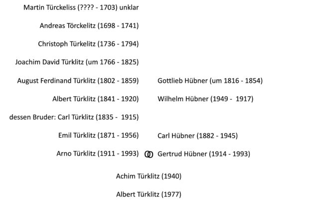 Zum Abschluss zeigen wir nochmal die finale Generationenfolgen der Familien Hübner und Türklitz in einer vereinfachten Darstellung: hier sind nur die jeweils männlichen Nachkommen, die die Generationenfolge sichern, dargestellt, nicht alle Geschwister der jeweiligen Generation. Man beachte die unterschiedlichen Schreibweisen des Nachnamens Türklitz in früheren Zeiten.