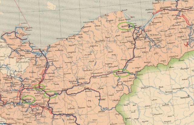 Bild 2: Der Weg der Cholera ging von Danzig (1) über Bromberg (2) und Cüstrin (3) bei Hohensaaten (4) in den Finow-Kanal weiter nach Berlin (markiert auf der Karte der Wasserstraßen in Preußen (Auszug) um 1905 von Bogdan Gisevius, Kartograph. Sammlung Stiftung Stadtmuseum, Inv.-Nr. SM 2018-00339, Reproduktion: Dorin Alexandru Ionita, Berlin, mit freundlicher Genehmigung ).