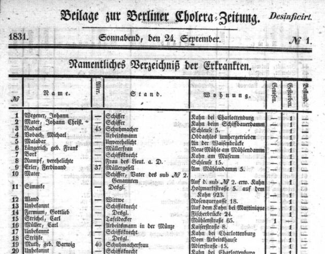 Bis zum Dezember 1831, als die Pandemie sich in Berlin dem Ende zuneigte, gab es 36 Ausgaben dieser Zeitung, die nicht nur an Ärzte und Beschäftigte im Gesundheitswesen verteilt wurde, sondern die den Anspruch hatte „das hiesige Publikum über den täglichen Stand und Gang der Cholera in unserer Stadt durch spezielle Nachweisungen der Ergebnisse der Erkrankungen, Genesungen und Sterbefälle, wie die fortwährend zur Hemmung der Seuche ergriffene Maaßregeln in genauester Kenntnis“ zu geben (3). Die Zeitung enthielt die vollen Namen (!), Alter, Beruf und Wohnadressen aller 2.249 Erkrankten (Stand vom 26. Dezember 1831), von denen 1.417 verstorben (63%) und 829 (36,8%) genesen waren; bei 3 Personen (0,2%) war der Verlauf noch nicht entschieden.