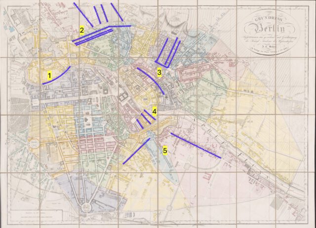 Bild 6: Die am meisten betroffenen Straßen der Stadt (mit mehr als 20 Fällen). Nach dem Ausbruch am Schiffbauerdamm (1) ist es vor allem das sogenannte Berliner Voigtland (2) vor dem Rosenthaler Tor, die Königsstadt vor dem Königstor am Alexanderplatz (3), die Fischerinsel und -brücke in Alt-Berlin (4) und die Luisenstadt (5) (markiert auf dem Sineck-Plan von Berlin von 1840).