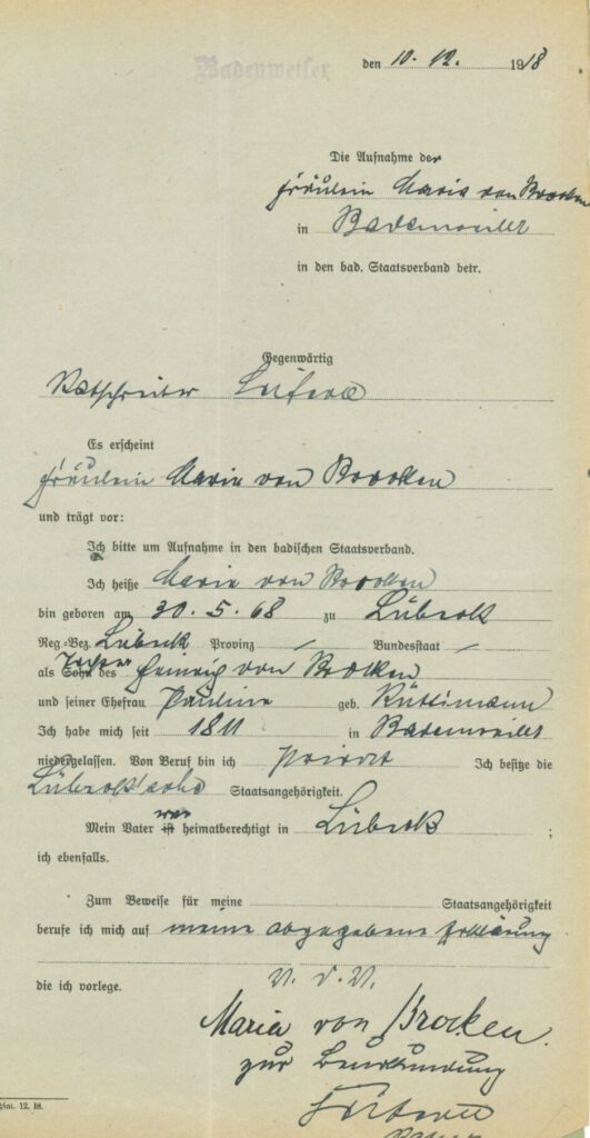 1911 verschwand Maria von Brocken aus dem Berliner Adressbuch: Sie zog nach Badenweiler im Markgräflerland, wo sie die Kriegszeit überstand, 1918 die badische Staatsangehörigkeit erhielt (Bild 6) und bis 1923 blieb – dann zog wie, vermutlich wegen des Todes ihrer Mutter einerseits und der hohen Inflationskosten andererseits, die in diesem Jahr ihr Maximum erreichten, zurück nach Lübeck in ihr Elternhaus. Hier lebte sie noch weitere 20 Jahre und starb im Februar 1947. In einem Testamentsentwurf von 1913, das sie in Badenweiler verfasste, setzte sie ihre Mutter als Alleinerbin ein, hilfsweise, falls diese verstorben, ihren Bruder. Auch ihr späteres, endgültiges Testament enthielt keinen Hinweis auf ihre Freundschaft mit Dora Hitz. Die Einwohnermeldekarte von Lübeck, in der An- und Abmeldungen aus Lübeck notiert wurden, weist aus, dass Maria von Brocken zumindest im Mai 1918 noch einmal kurzfristig in Berlin weilte, wo sie allerdings am Mariannenplatz 2 gewohnt haben muss.