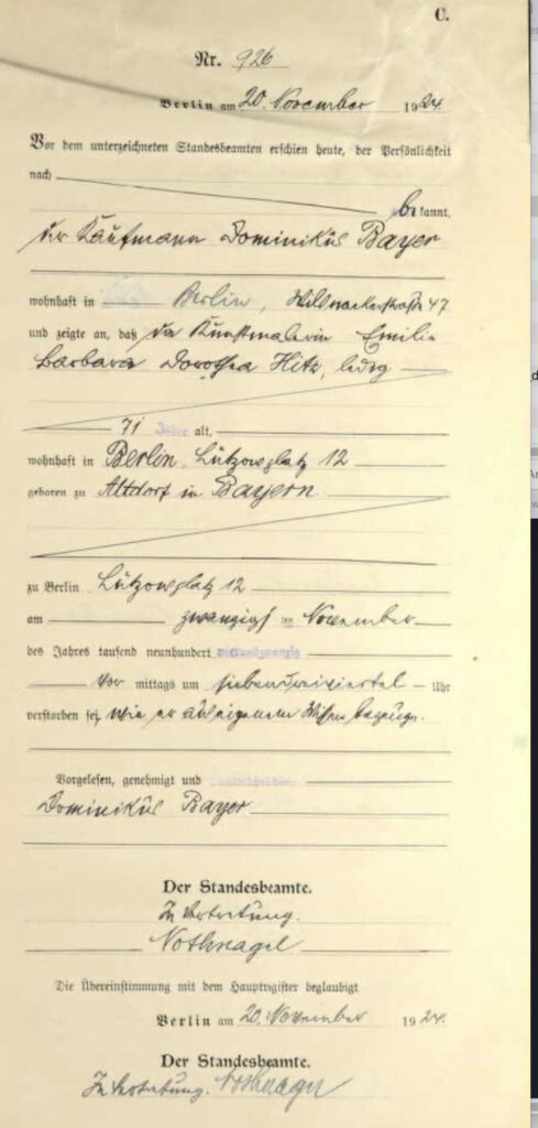 Bild 7: Sterbeurkunde der Dora Hitz von 1924
