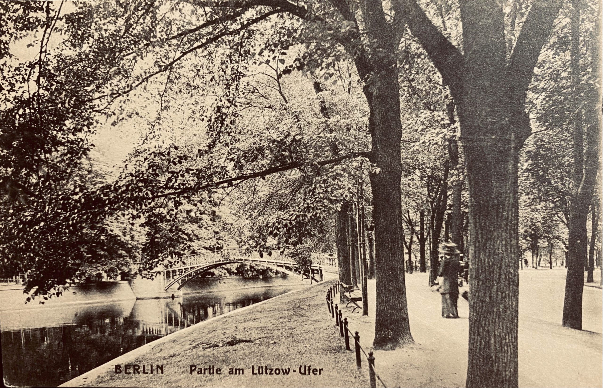 Wie den Blumeshof, den wir schon besucht haben (mittendran vom 15. Juli 2021), so gibt es auch die Dörnbergstraße nicht mehr, sie wurde nach dem 2. Weltkrieg eingezogen. In unserer Geschichte der Straße (mittendran vom 27. September 2021) vor zwei Jahren hatten wir wenige Fotos gezeigt, im entsprechenden Kapitel des Buches (1) vor allem Trümmerfotos. Jetzt also ein neuer Blick in die Dörnbergstraße, von der Lützowstraße aus und im Jahr 1900 (Bild 1). Die Straße verlief etwa da, wo heute das östliche Ende des Hotels Sheraton ist, es war eine kurze Straße mit nur sieben Hausnummern, an deren Ende ahnt man die Baumreihen entlang des Lützowufers. Dort, auf dem Eckgrundstück der linken Seite lag das Café Borussia und sein Garten (Bild 2), und die heute zweispurige Rennstrecke entlang des Kanals war damals eine lauschige Allee (Bild 3) einschließlich des Blicks auf die Lützowbrücke (heute Hiroshima-Steg), die auf die andere Seite des Kanals zur Villa von der Heydt führte.