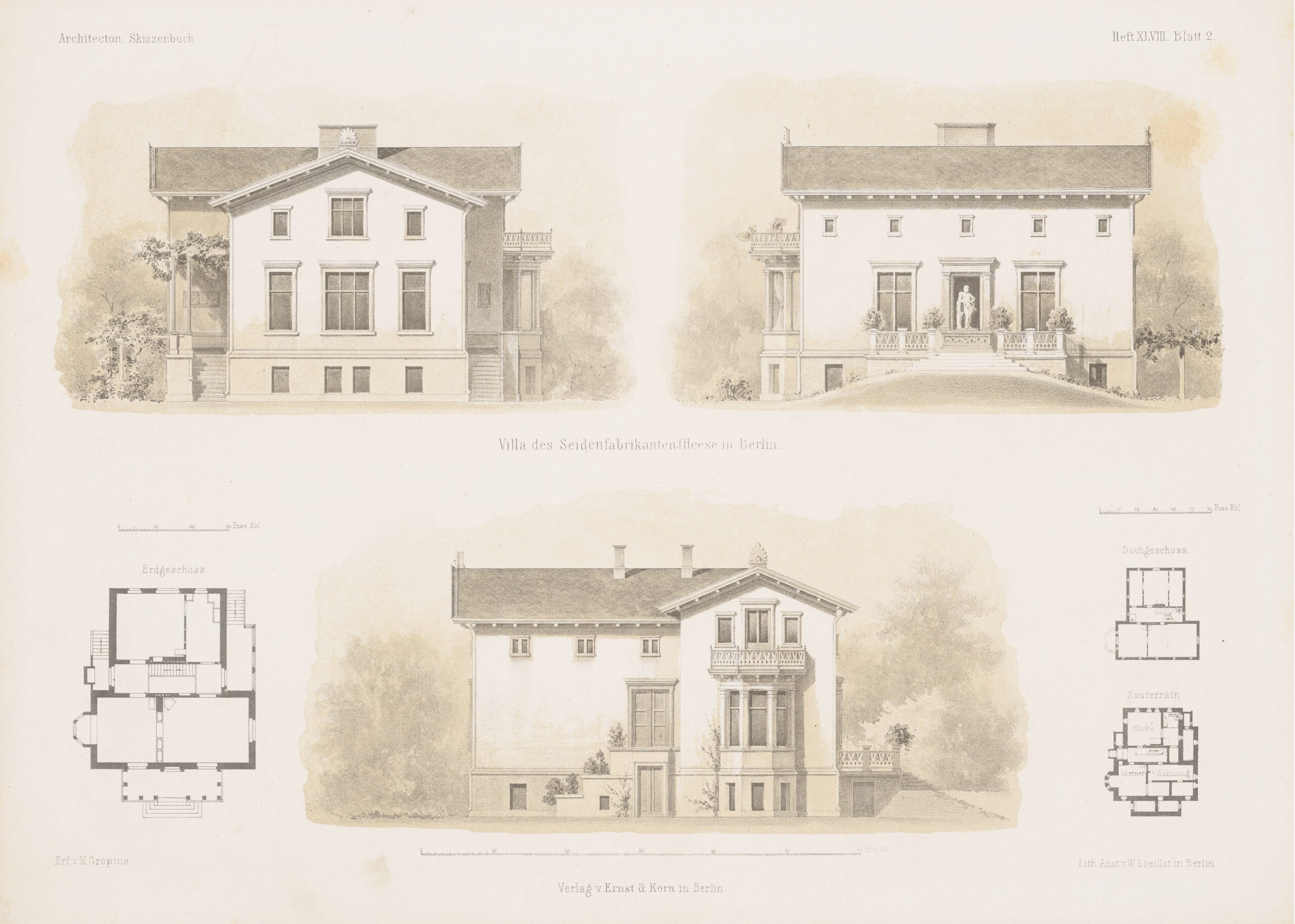 Man mag kaum glauben, dass auf der rechten Straßenseite 40 Jahre zuvor nur eine einzelne Villa stand, die des Seidenfabrikanten Adolph Heese (1784-1862), die erste Villa, die Walter Gropius (1824-1880) in jungen Jahren (1856) geplant und gebaut hatte (Bild 4) – sie blieb dort bis 1888. Im Jahr 1900 stand hier, an der Ecke gegenüber dem „Café Borussia“, das Reichsamt für Statistik. Aber die Jahre zwischen 1850 und 1900 waren die vielleicht dynamischsten in der Geschichte Berlins. In dieser Zeit erst, genauer 1862, wurde dieser Teil Schönebergs, zuvor meist nur Felder und Wiesen, in das Stadtgebiet Berlins eingegliedert, mittels des sogenannten Hobrecht-Plans (2).